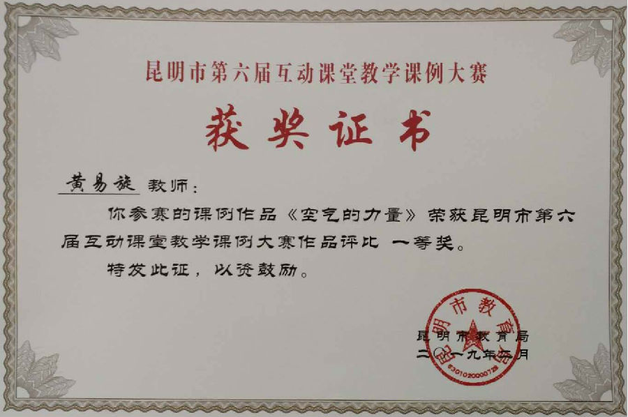 在继2018年4月赵琼老师荣获昆明市第五届互动课堂教学案例大赛一等奖后,今年4月,我校初中物理组再创佳绩,黄易旋老师的《空气的力量》课例荣获昆明市第六届互动课堂教学课例大赛一等奖。