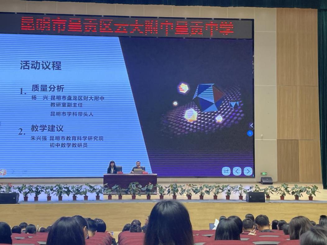 砥志研思,笃行致远,随着2024年中考的尘埃落定,昆明市初中数学2024-2025学年上学期第1次教研活动在云大附中呈贡中学举行。本次活动由财大附中教研室副主任杨兴和昆明市教育科学研究院初中数学教研员朱兴强两位老师主讲,旨在全面审视今年中考数学试题的特点,更聚焦于剖析学生在考试过程中暴露的主要问题,并据此提出切实可行的教学建议,提升昆明市初中数学教育的整体水平。