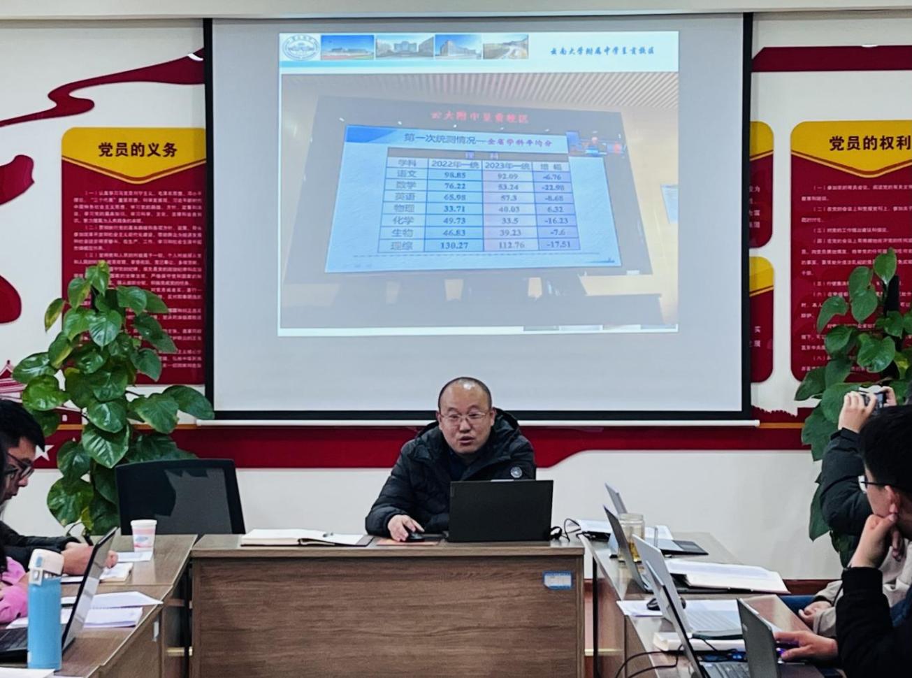 为精准诊断学校高三年级参加云南省第一次高中毕业生复习统一检测的考情,明确未来80多天备考冲刺的方向和策略,云大附中呈贡校区于2023年3月13日召开了2023届高三第一次省统测质量分析暨高考备考冲刺动员会。学校党总支书记倪芳、副校长曹玉、副校长苏金祥,教务主任杨云、副主任高荣菊出席会议,高三年级全体教师参加。会议由高三年级组长王凯主持。